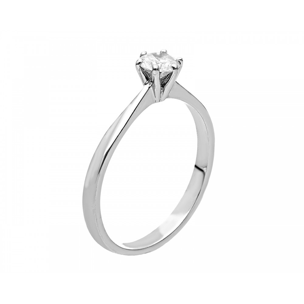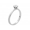 Solitario en oro blanco, la forma en la que esta sujeta el diamante en sus seis uñas le da un soporte y seguridad inigualable. Esta joya es perfecta para brillar en uno de los días más esperados de tu vida.