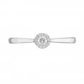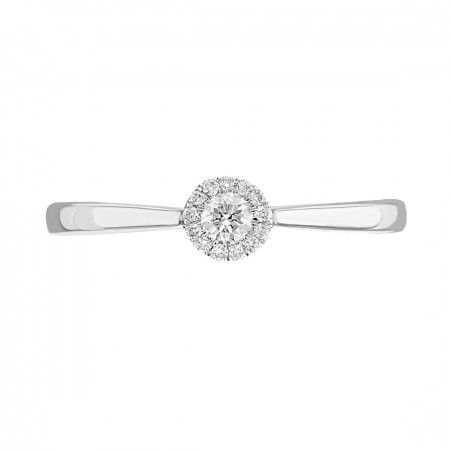 Anillo de compromiso en oro blanco, la forma circular en pavé que sujeta los diamantes es única. Esta joya es perfecta para ser diferente en uno de los días más esperados de tu vida.