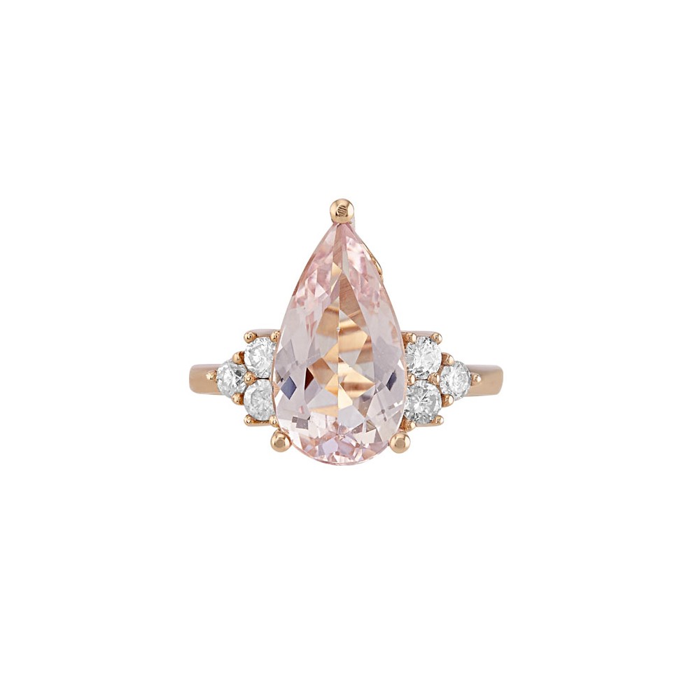 Espectacular anillo en oro rosa con morganita natural en corte pera.