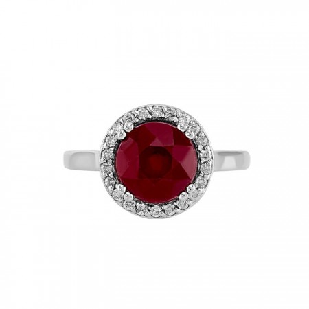 Anillo clásico con un rubí central con halo de brillantes en corte redondo.