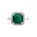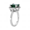 Anillo solitario en oro blanco con Esmeralda en corte princess con halo de diamantes.