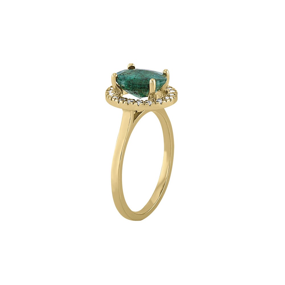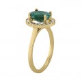 Anillo de lujo en oro amarillo con halo de diamantes y un hermoso Esmeralda oval.