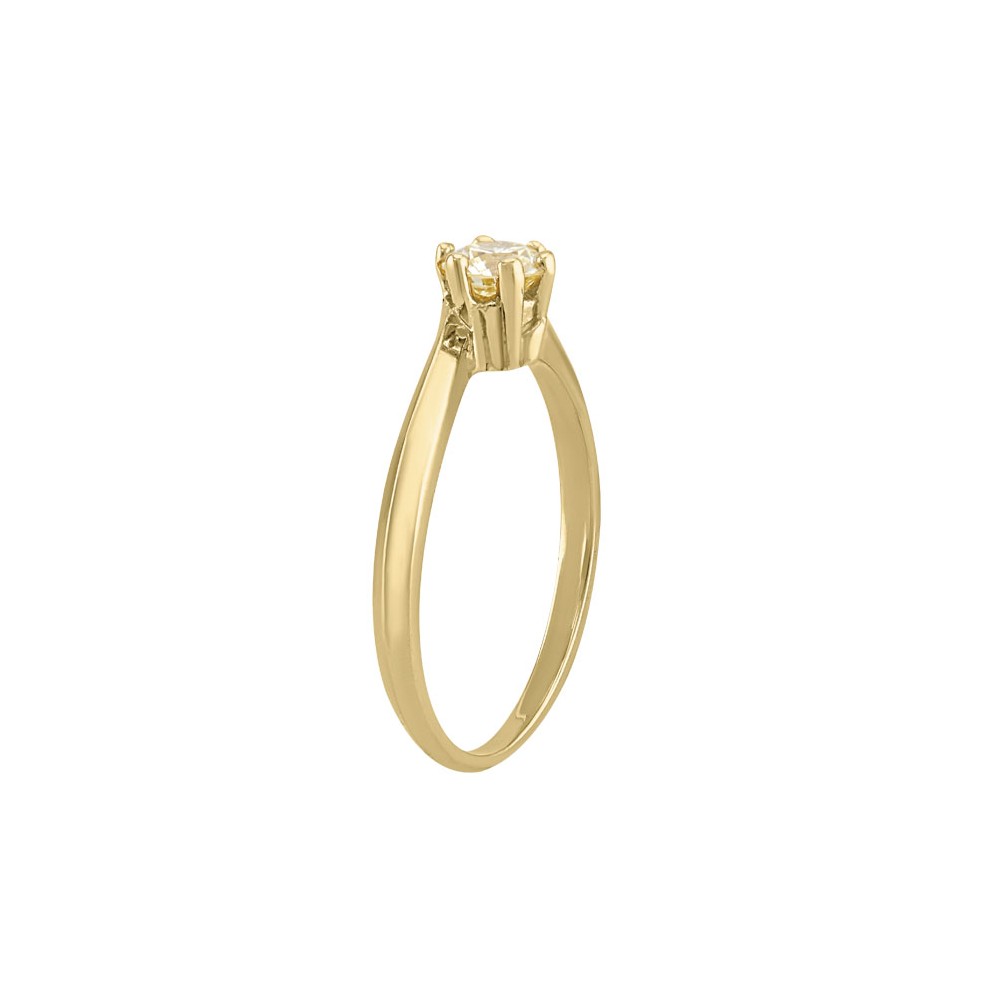 Anillo solitario de seis uñas en oro amarillo con un diamante central corte redondo.