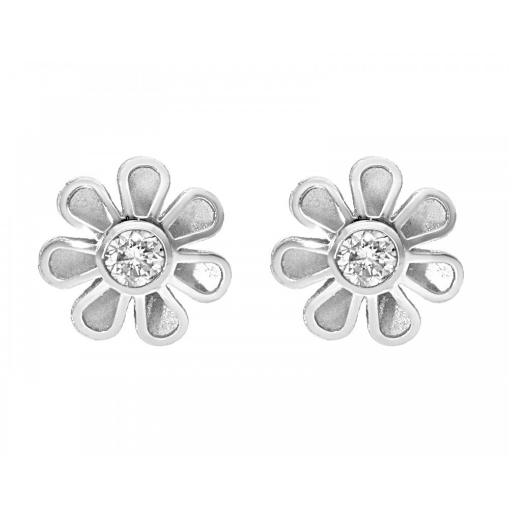 Hermoso par de broqueles en oro blanco en forma de flor, una joya delicada y romántica para el uso habitual.