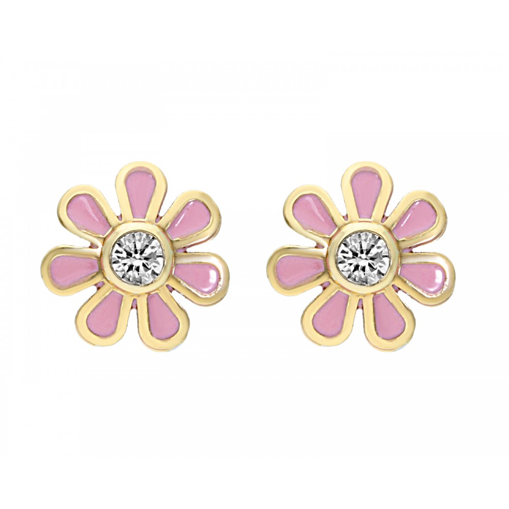 Broqueles en oro amarillo en forma de flor con un esmaltado realizado a mano, en tono rosa pastel para detallar los pétalos y en su centro un discreto diamante. Su broche de cierre de rosca es ideal para la seguridad de bebes o niñas pequeñas.