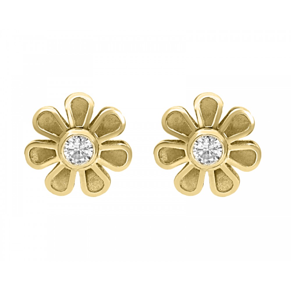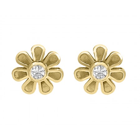 Broqueles con un delicado diseño de flor en oro amarillo con un diamante central, de discreto tamaño que no pasan desapercibidos.