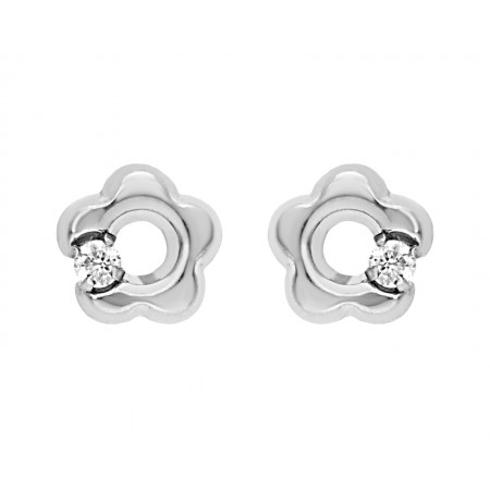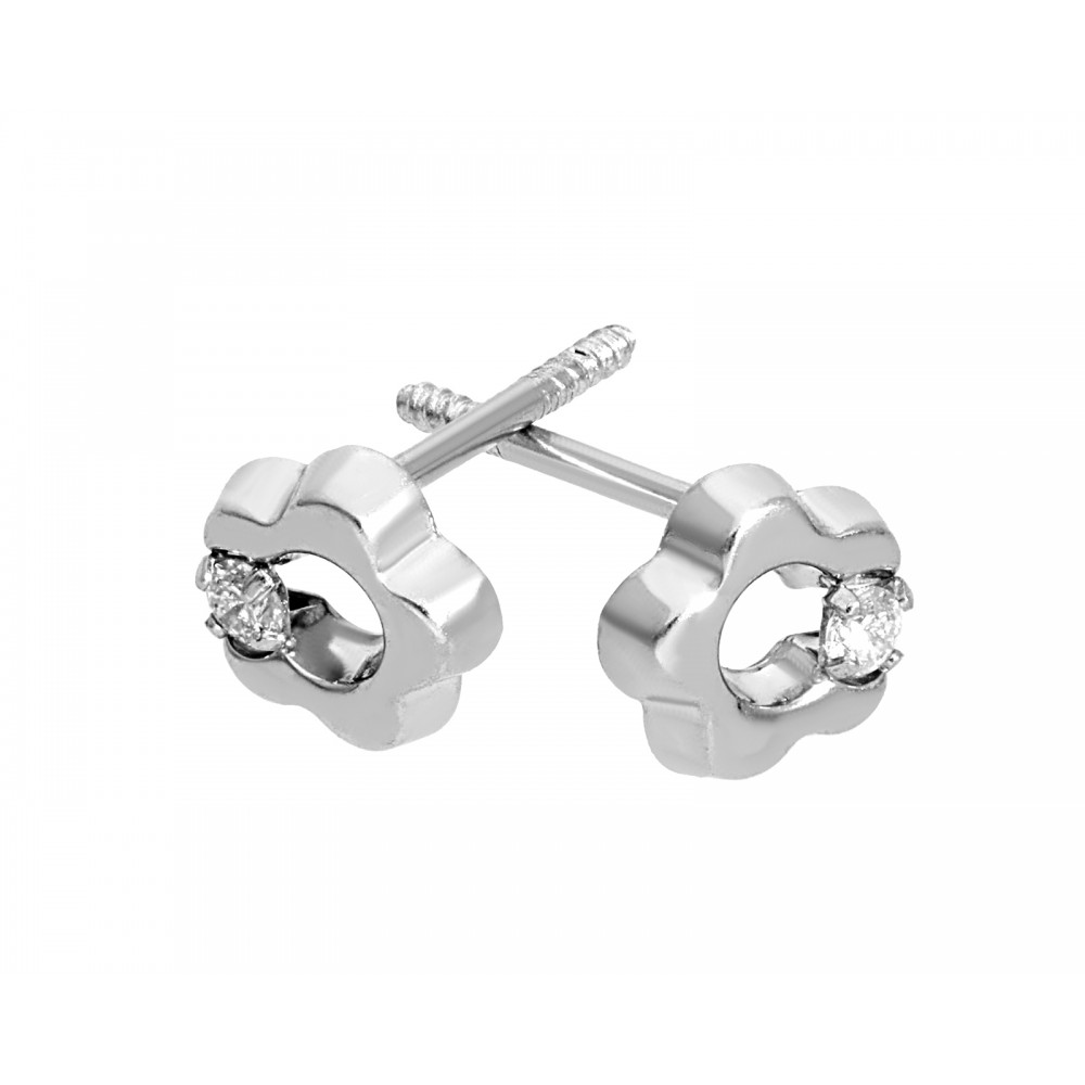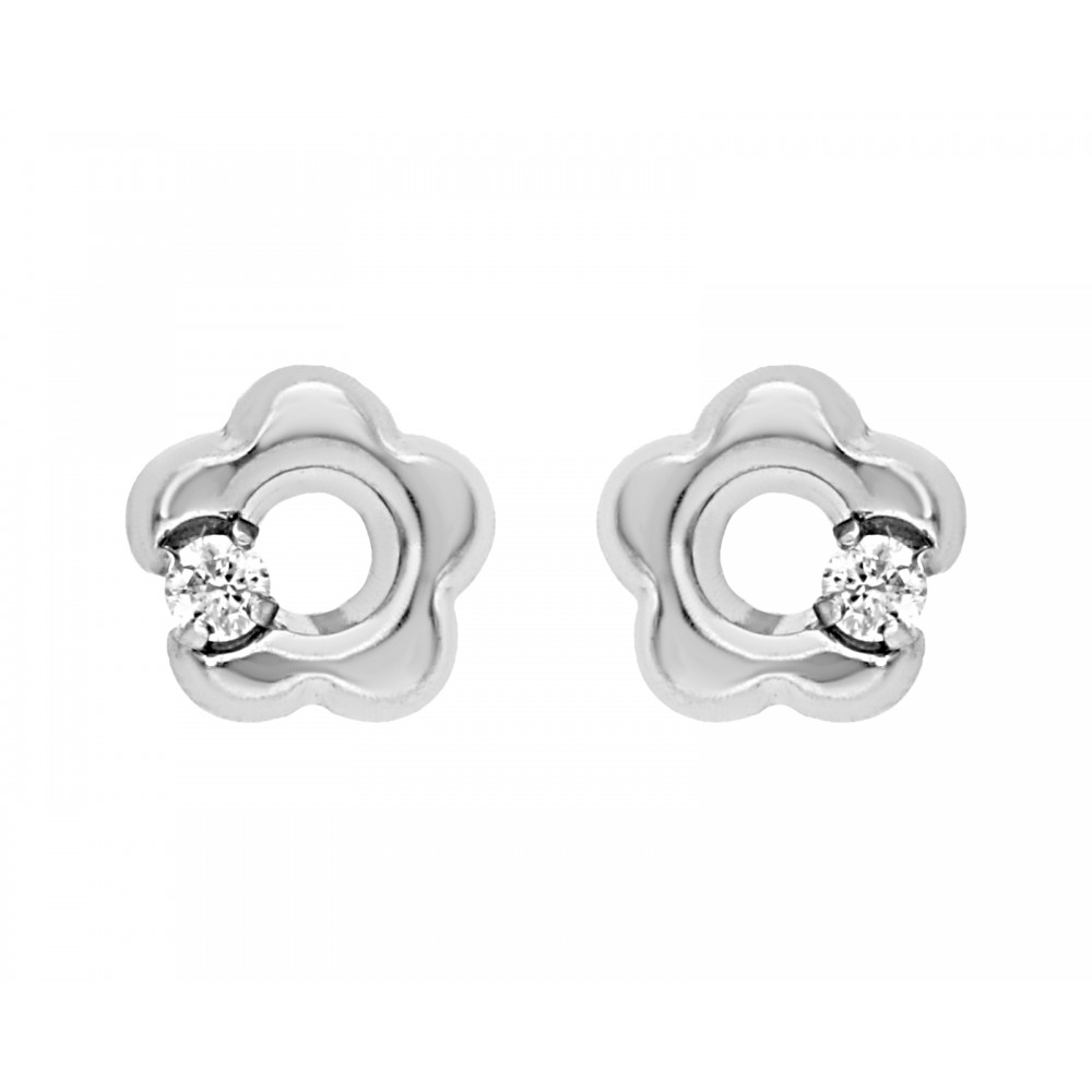 Broqueles en oro blanco en forma de flor acompañada de diamantes, una joya perfecta para el infante.