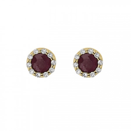 Hermosos aretes tipo broquel en oro amarillo con un clásico halo de brillantes y rubí central en corte redondo.