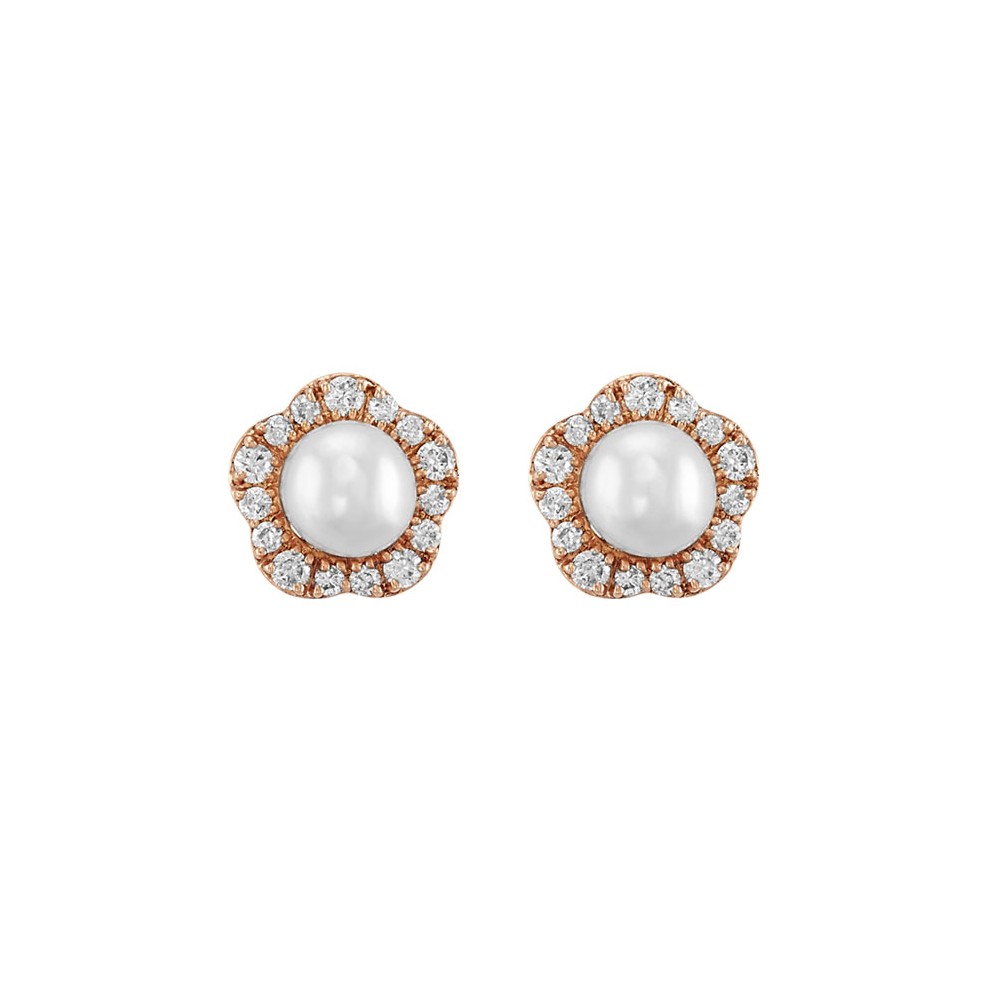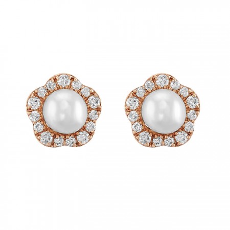 Aretes en oro rosa con perla y diamantes, en forma de flor.
