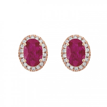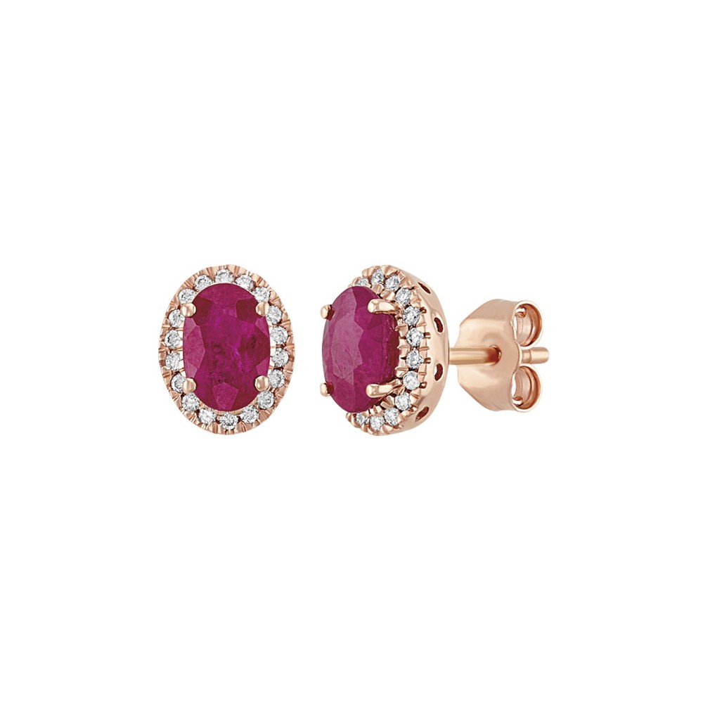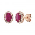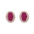Aretes en oro rosa de 14K con rubies naturales en corte oval rodeados de un hermoso halo de diamantes.