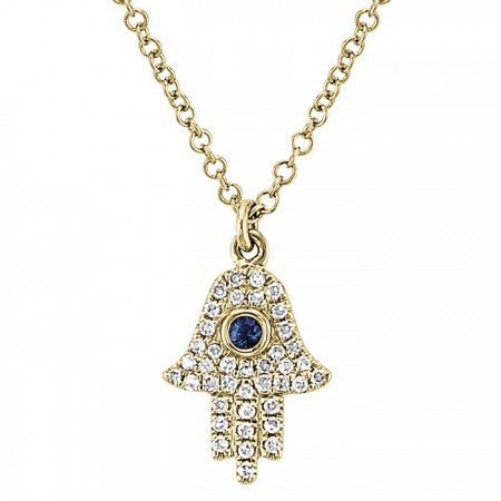 Gargantilla en oro amarillo con dije de mano de Fátima con diamantes y un zafiro central.